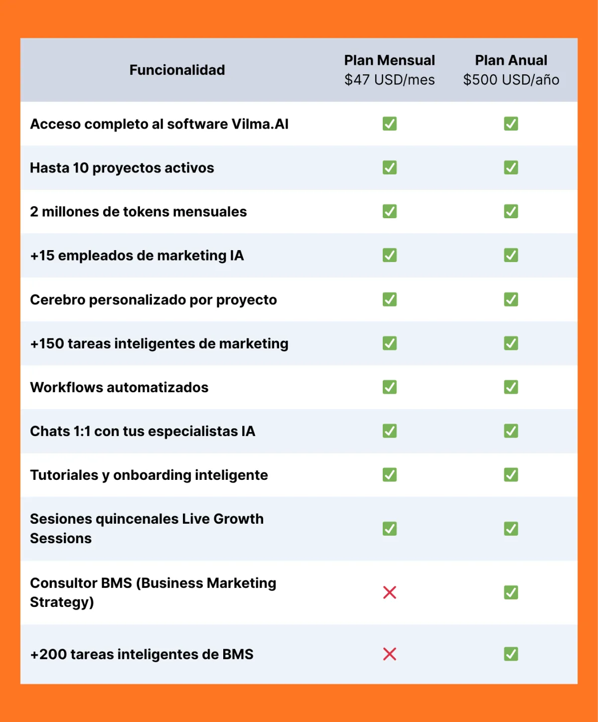 El plan mensual te da acceso completo al software Vilma.AI, con todos los agentes, proyectos y funcionalidades activas.